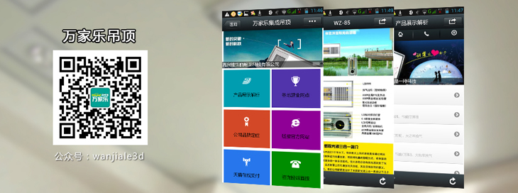 传统行业的营销也越来越离不开微信,万家乐吊顶推出微信官网,将自己的服务内容以更轻便的方式传达给客户,更能吸引顾客眼球。万家乐吊顶的咨询客户量同比增长达到惊人的20%!